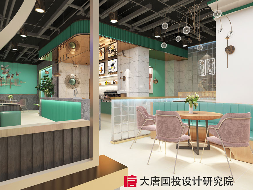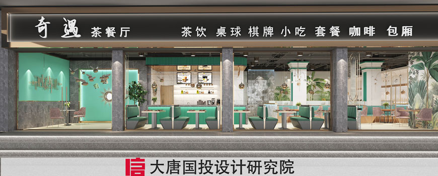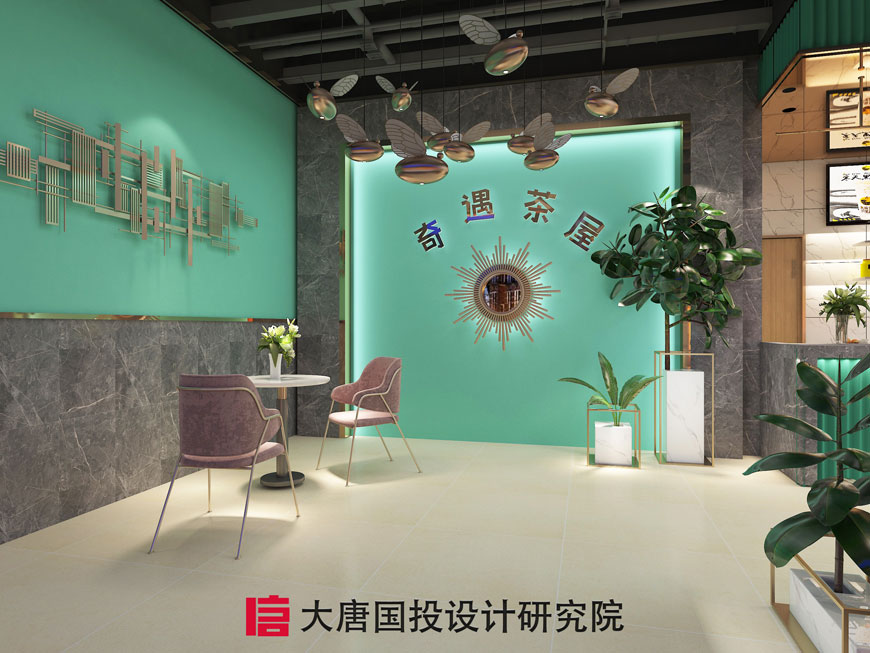 奇遇茶餐廳設計的入口由大理石紋路的瓷磚和綠色墻面構成,創建出一個舒緩的流線設計,引導著顧客緩慢進入這個愜意的空間。